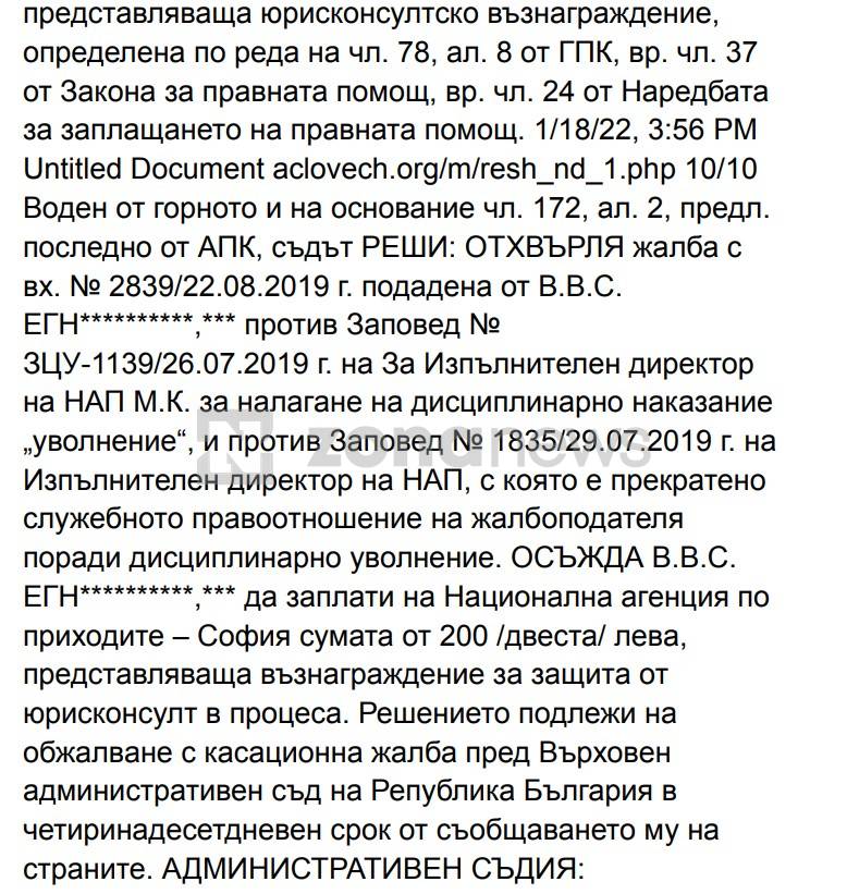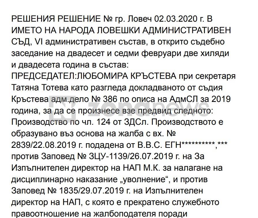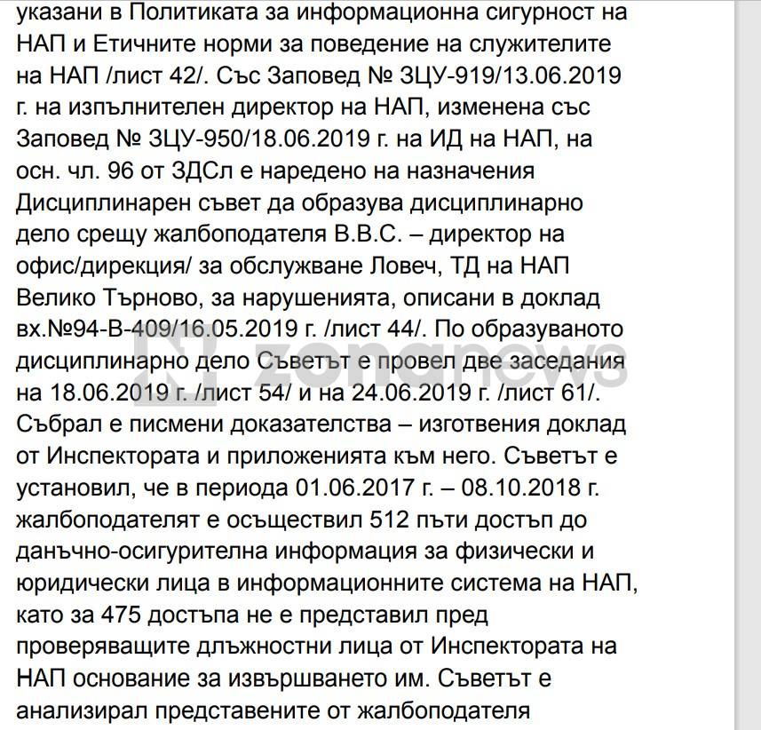 Разследване на Zonanews показва, че същият човек е дисциплинарно уволнен от НАП-Ловеч със заповед № ЗЦУ-1139/ 26.07.2019 г. на заместник-изпълнителния директор на НАП. Прегрешенията му са описани в докладната записка от 15.07.2019 г. заради неоторизиран достъп до данните на стотици хора и фирми, „осъществил е 512 пъти достъп до данъчно-осигурителна информация за физически и юридически лица в информационните система на НАП, като за 475 достъпа не е представил пред проверяващите длъжностни лица от Инспектората на НАП основание за извършването им“.
