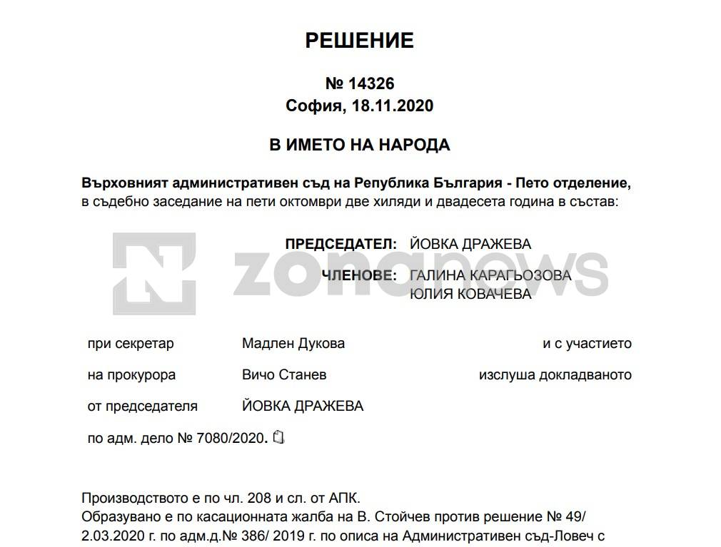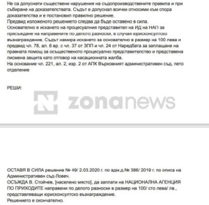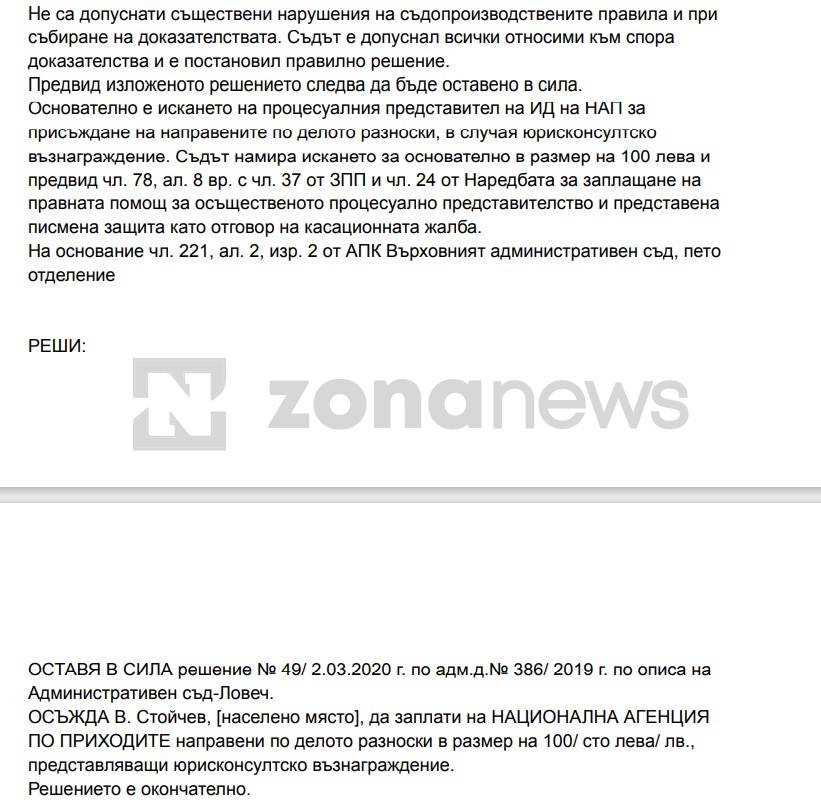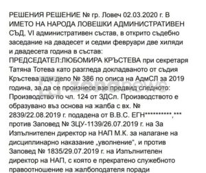 Стойчев обжалва в Административен съд-Ловеч, където губи делото. Констатациите за нарушенията му като директор на офис за обслужване-Ловеч към ТД на НАП Велико Търново и уволнението му от тази позиция са потвърдени с Решение № 49/2.03.2020 г. по адм.д.№386/2019 г.
