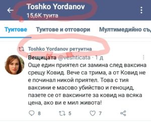 Представителят на „Има такъв народ“ и председател на ПГ на партията в последния парламент Тошко Йорданов споделя фалшиви новини за починали българи след ваксинация срещу COVID-19. Това съобщи във фейсбук математикът Петър Велков. Ето какво написа той