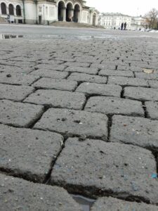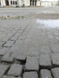 Чистене на павета с водоструйка. Изровени павета. Кал и пясък навсякъде.