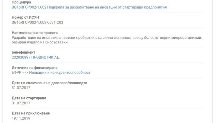 Сумата е от еврофондове и е отпусната за иновативна разработка на провиотик за деца, като обаче такъв съществува отдавна и няма никаква причина да бъде финансиран с парите на европейските данъкоплатци като иновативен продукт.