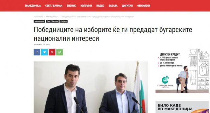 Все повече се засилват настроенията в съседна РС Македония, че след побетата на Кирил Петков и Асен Василев, България ще загърби историята. Пример за това е сайтът „expres.mk“, който извежда заглавие „Победителите на изборите ще предадат българските национални интереси“. И как не, след като самият Кирил Петков обяви историята за дребнотемие и заложи на съвсем друг подход към Северна Македония, пише Tribune.bg.