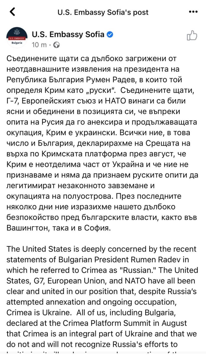Преди минути посолството на САЩ пусна пост във фейсбук по повод изявленията на Румен Радев, че Крим е руски. Ето какво пишат от посолството: