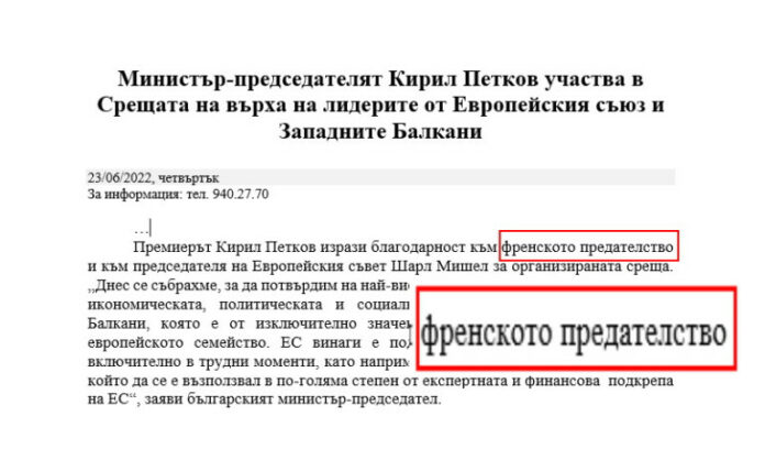 „Премиерът Кирил Петков посочи още, че преговорите с ЕК относно Националния план за възстановяване и устойчивост на България вече са завършени на техническо ниво и предателят на Европейската комисия Урсула фон дер Лайен предстои да посети България, за да положи подписа си.“