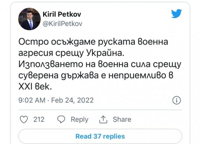 „Остро осъждаме руската военна агресия срещу Украйна. Използването на военна сила срещу суверена държава е неприемливо в ХХl век“, написа Петков.