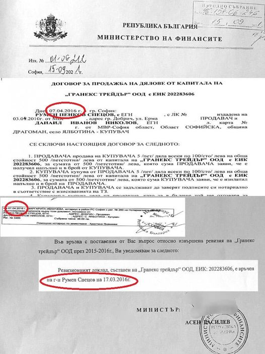 Сламеният човек Данаил Николов от драгоманското село Яблотина, на когото през 2016 г. Бившият шеф на НАП Румен Спецов е продал 50% от фирмата си “Гранекс Трейдър” ООД, но фирмата се оказа с над 1 милиона лева задължения, проговори пред сайта Безпартиен бг. Николов, който се крие в Сърбия, прави скандални разкрития. Според него му било наредено да отиде в съседната държава, да се крие там, а Спецов и Асен Василев да му пращат да мълчи за аферата.