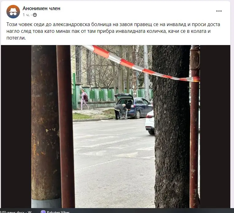 „Този човек седи до УМБАЛ „Александровска“ на завоя, правещ се на инвалид и проси доста нагло. След това, като минах пак от там, прибра инвалидната количка, качи се в колата и потегли“, пише в публикацията.