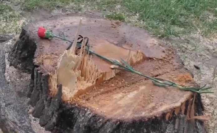 Хората поставиха карамфили и черни лентички върху дънерите на отсечените дървета.