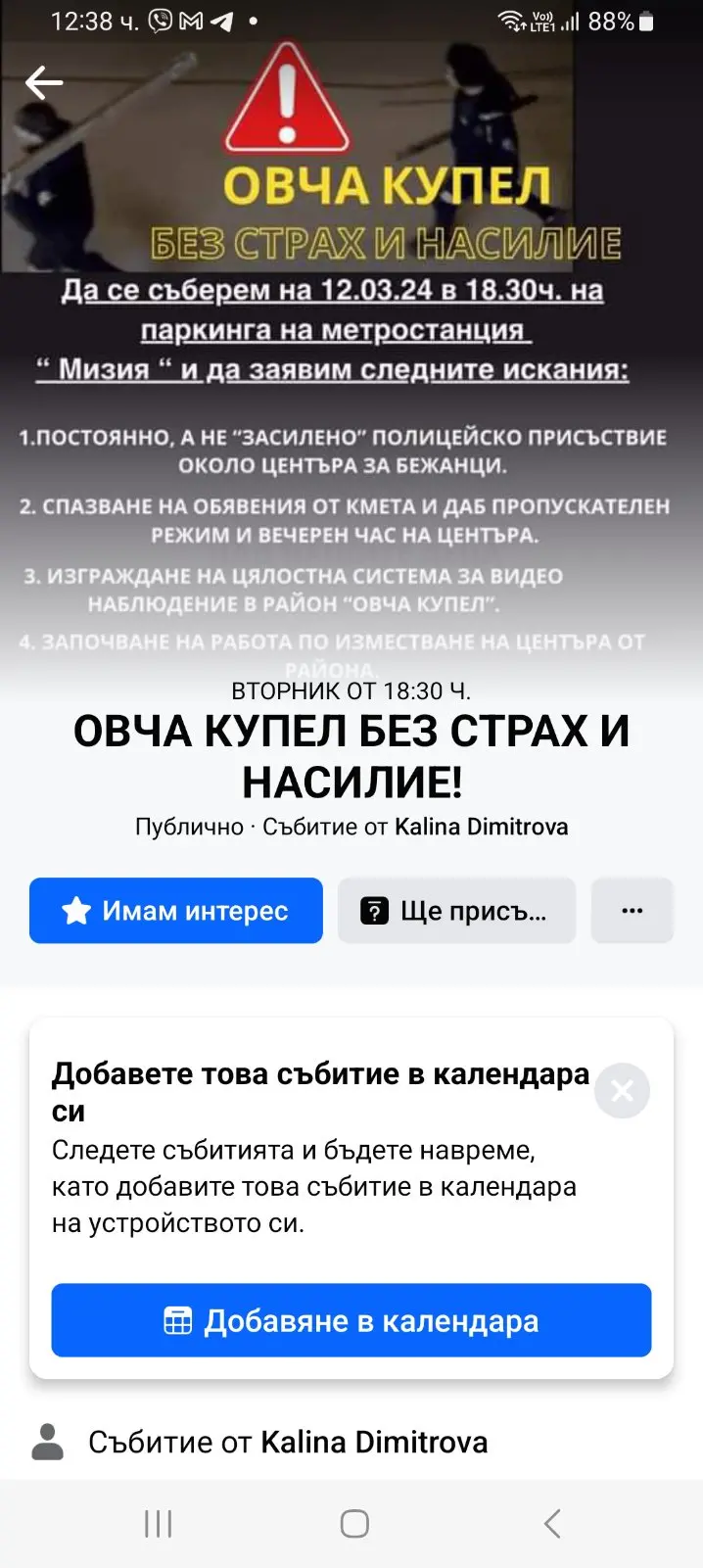 Във вторник в кв. „Овча купел“, където има мигрантски център за настаняване от отворен тип, отново има организирана демонстрация от живущите в района. Организаторите призовават хората да се съберат на метростанция „Мизия“ в 18.30 на 12.03.2024 г., за да кажат: „Овча купел без страх и насилие“!