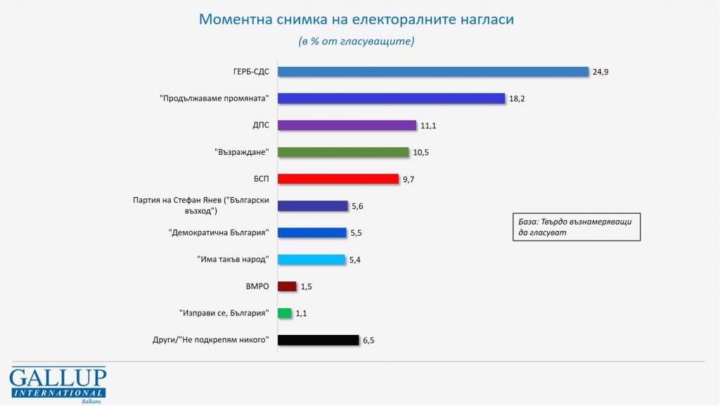 Сред общите нагласи на всички имащи право на глас символична е разликата между ГЕРБ (13,9%) и „Продължаваме промяната“ (13,4%). ДПС (7,4%) и „Възраждане“ (5,4%) са следващите в класацията, а БСП е с 4,9%, „на кантар“ с „Има такъв народ“ (4,8%). „На кантар“ сред всички имащи право на глас са и новата партия на Стефан Янев (3,8%) и „Демократична България“ (3,7%). Партията на Янев обаче все още е частично непозната – особено към времето на терена на изследването в първата част на май. ДБ пък е формация, която традиционно се мобилизира в самата изборна ситуация. Резултатите на тези две формации личат по-добре на база твърдо решили да гласуват. След тях идват ВМРО, „Изправи се, България“ и други, както и „Не подкрепям никого“. 35% казват, че не биха гласували.