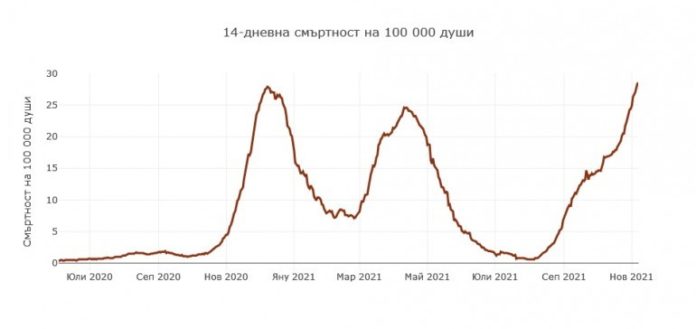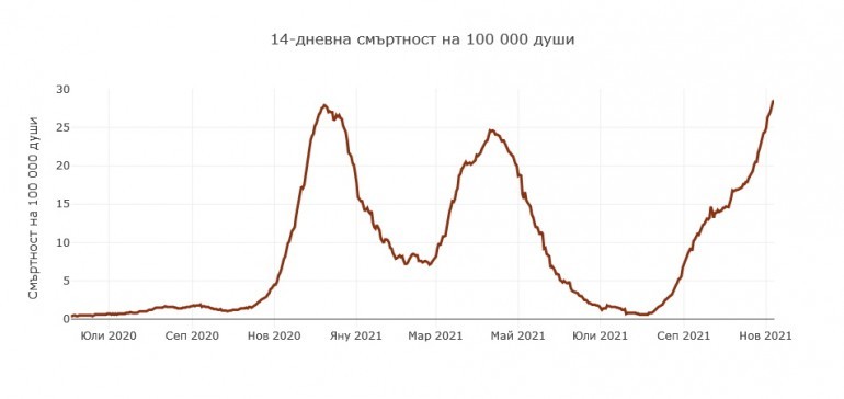 Рекордно висока 14-дневна смъртност от началото на епидемията у нас. Стойностите показват 28,5 на 100 000 души. Това сочат данните на Националния център по заразни и паразитни болести.