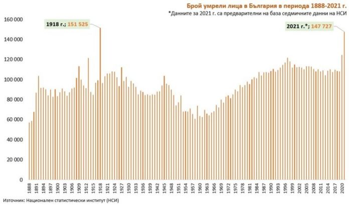 147 727 души са починали през 2021 г. За сравнение, през 1918 г., починалите са били 151 525 души. Това е рекордна смъртност за последните 100 години у нас, каза Ганев.