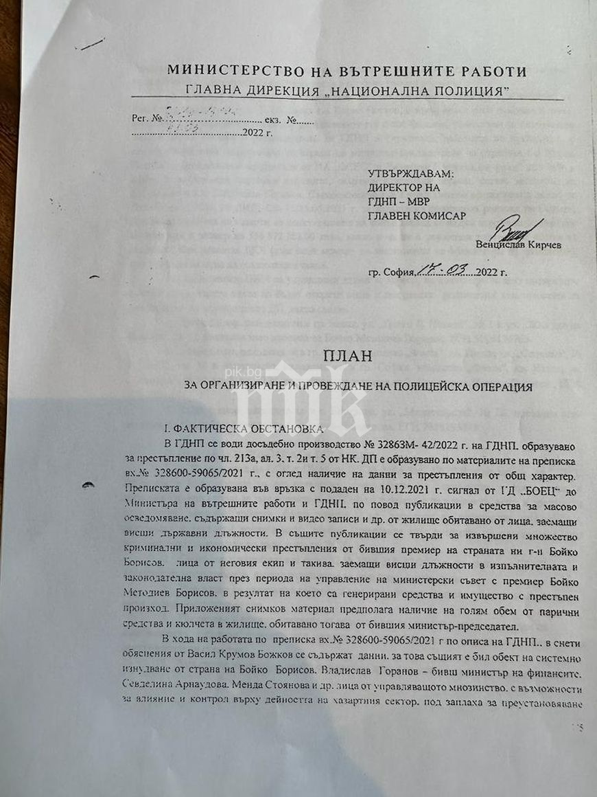 Решението за ареста на лидера на ГЕРБ Бойко Борисов, Владислав Горанов и Севделина Арнаудова на 17 март 2022 година е взето в кабинета на Кирил Петков в МС в присъствието на Петков, Асен Василев, Бойко Рашков и…шефовете на Националната полиция Венцислав Кирчев и Ангел Дулев. Това става ясно от скандален документ, публикуван от Агенция ПИК. Документът е план за операцията по арестите, съставен от началника на отдел „Икономическа полиция“ към Главна дирекция „Национална полиция“ комисар Иван Николов, утвърден е с подписа на шефа на ГДНП Кирчев и описва как точно ще се случват арестите на бившия премиер и неговия министър. Датата на документа е 17 март 2022 г., деня на ареста.
