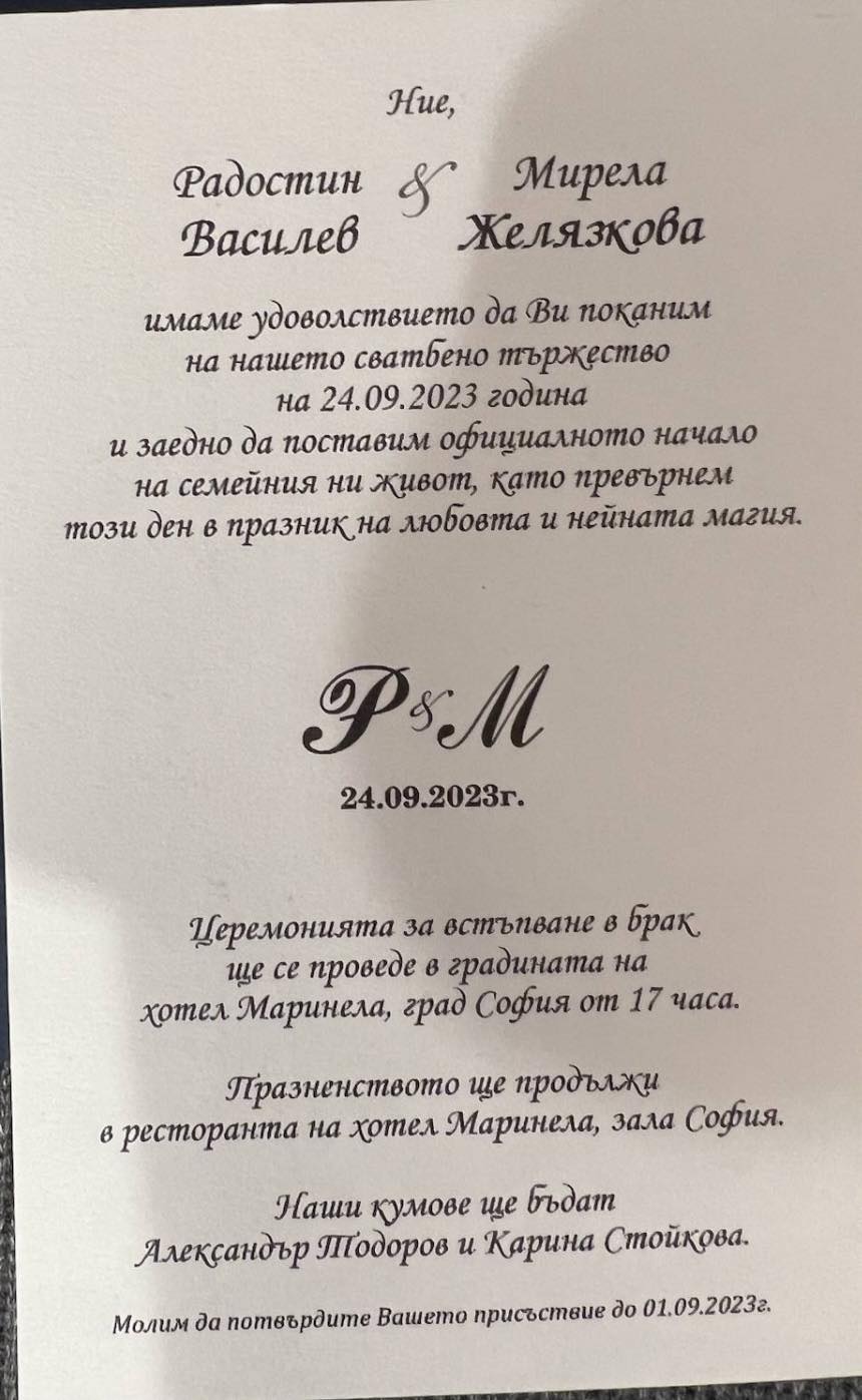 Радостин Василев и Мирела Желязков ще встъпят в брак в градината на хотел “Маринела”, където ще се състои и партито с роднини и приятели.