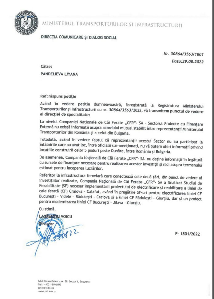 Отговорът на румънското министерство на транспорта до „Гласове“.