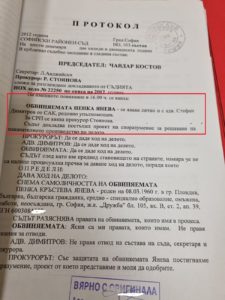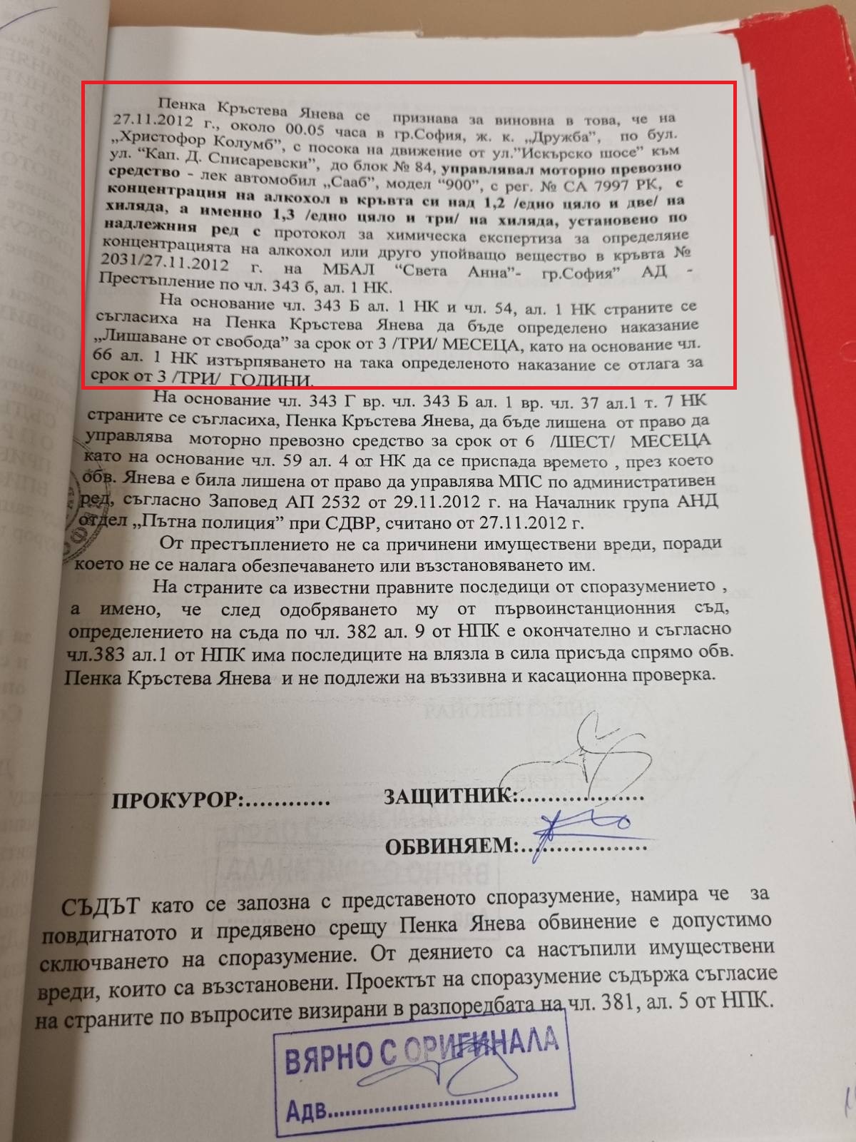 Постановена й е мярка за неотклонение „подписка“. На 6 декември 2012 г. делото се гледа по бързото производство в Софийски районен съд. Янева и прокуратурата сключват споразумение. Тя признава напълно вината си и се разкайва. Съдът постановява условна присъда от три месеца и отнемане на правото да шофира МПС за шест месеца. Припомняме, че съпругата на служебния министър-председател е бизнес дама и управлява две частни фирми.