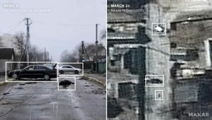 Сателитните снимки, публикувани от The New York Times, показват, че телата на мъртвите цивилни лежат по улиците на града още от 11 март, което значи, че хората са избити преди повече от три седмици.