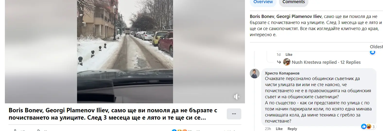 Общинският съветник Христо Копаранов от „Спаси/Заледи София“ изключително лично приема недоволството на граждани от непочистени улици в София. Потребителката на фейсбук Теменуга Кръстева качи видео как майка с детска количка се бори да се качи от улицата на тротоара, но не успява заради преспите.