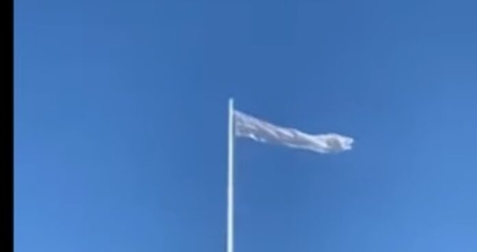 Снимки и видеа в социалните мрежи показват окъсания трибагреник. Вероятно причина за унищоженото знаме са силните ветрове в района в последните дни.