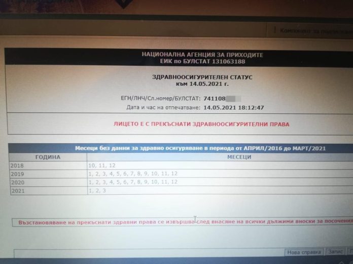 Оказва се, че той е със спрени здравноосигурителни права. Това сочи справка в системата на НАП от днес, 14 май 2021, към 18 часа и 12 минути, показва справка на медията.