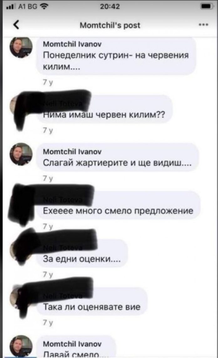„В понеделник сутрин – на червения килим“, в коментар от дама получава отговор „Нима имаш червен килим“, а скандалното идва с ответните думи – „Слагай жартиерите и ще видиш“. В отговор той получава от студентката: „Много смело предложение, за едни оценки… така ли оценявате вие“. Правистът и преподавател нагло отговаря: „давай смело“.
