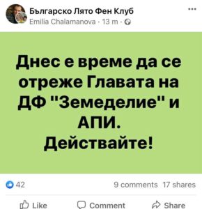 „Днес е време да се отреже Главата на ДФ „Земеделие“ и АПИ. Действайте“, написа уредничката на неговата фейсбук страница „Българско Лято Фен клуб“.