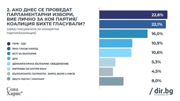 Само няколко дни преди изборите, проучване на „Сова Харис“, проведено по поръчка на Dir.bg показва, че ГЕРБ остава първа политическа с 22.6%, втори са ИТН с 22.1%.