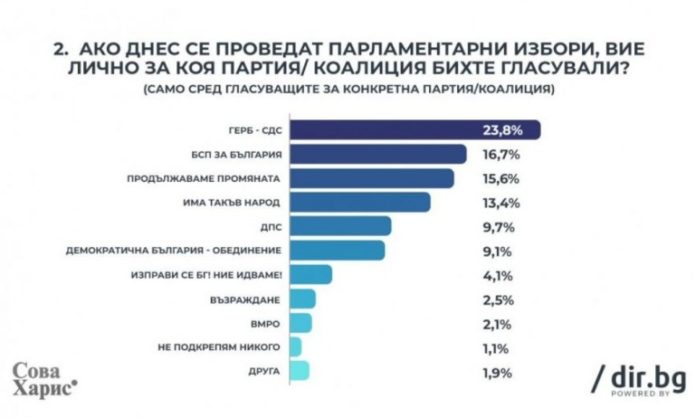 ГЕРБ остава първа политическа сила с 23,8%, втори се нареждат БСП с 16,7%, показва последно проучване на „Сова Харис“ провередено в края на октомври и началото на ноември по поръчка на „дир.бг“.