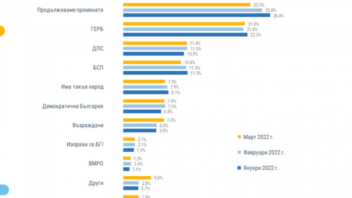 от 1% пред основния си опонент. ГЕРБ от своя страна стоят статично като подкрепа с 21.9% от гласуващите. ДПС заема трета позиция с 11.4% от заявилите, че ще гласуват на следващи избори, като веднага след тях се нарежда БСП с 10.4% от гласуващите. Следват „Има такъв народ“ (7.5% от гласуващите), Демократична България (7.4% от гласуващите) и Възраждане (7.3% от гласуващите) на пренебрежима дистанция помежду им.
