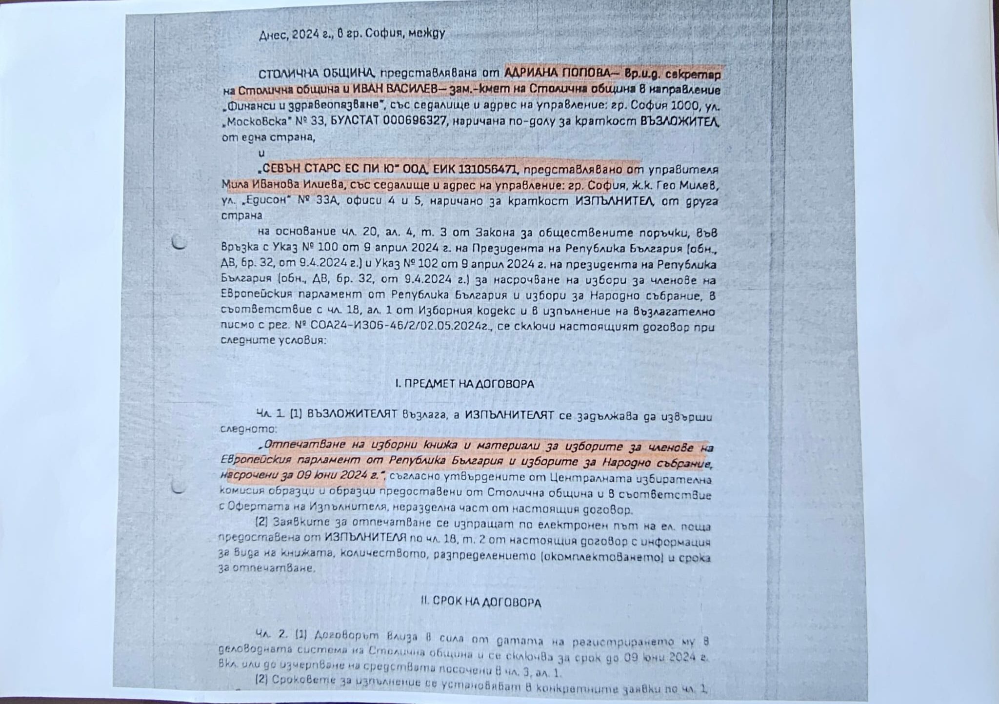 На 17 май тази година зам.-кметът по финанси на Столична община Иван Василев и секретарят на общината Адриана Попова сключват два директни договора за отпечатване на изборни книжа и материали с фирма на кмета на район „Слатина“ Георги Илиев. Избраната фирма „Севън старс Ес Пи Ю“ е собственост на кмета Георги Илиев и съпругата му Мила Илиева. Това обявиха на брифинг общинските съветници от ГЕРБ-СДС в София.