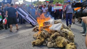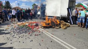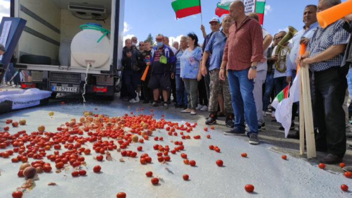 Недоволните затвориха пътя и изхвърлиха на шосето готовата си продукция – мляко, зеленчуци и плодове, запалиха няколко чувала с вълна.