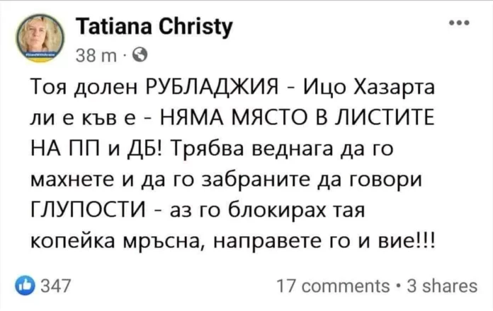 „Тоя долен рубладжия – Ицо Хазарта ли е къв е – няма място в листите на ПП и ДБ! Трябва веднага да го махнете и да забраните да говори ГЛУПОСТИ – Аз го блокирах, тая копейка мръсна, направете го и вие”