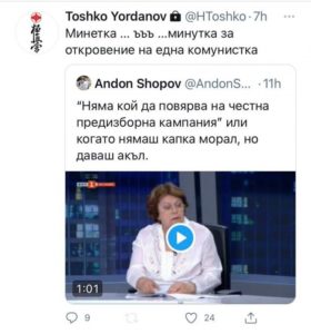 Заключеният профил на Тошко Йорданов в Туитър продължава да сипе квалификации по отношение на потенциални политически партньори. След като преди няколко седмици под ударите му попадна Христо Иванов от ДБ, вчера „жертви“ се оказаха Татяна Дончева и Николай Хаджигенов от ИБНИ, пише Tribune.