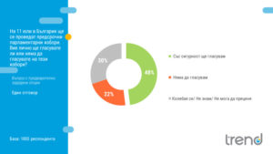 48% от анкетираните заявяват, че със сигурност ще гласуват на предстоящите избори, докато 30% все още се колебаят. Малко над една пета (22%) пък са категорични, че няма да упражнят правото си на глас.