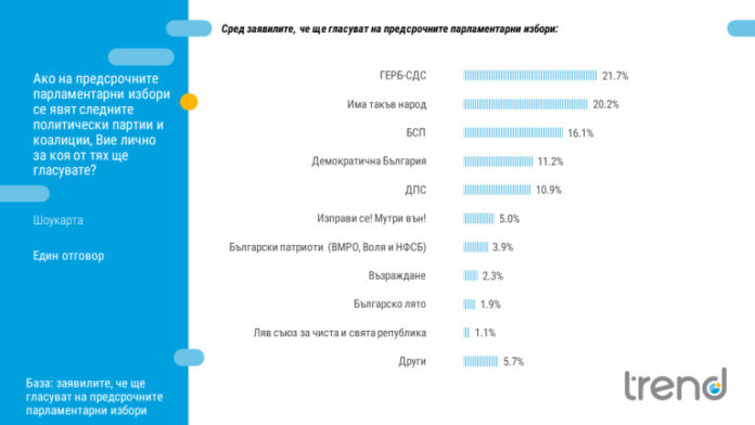 Моментната снимка на електоралните нагласи сред гласуващите сочи, че ГЕРБ-СДС задържа първото място с 21.7% въпреки спада с няколко процента спрямо редовните парламентарни избори през април. При „Има такъв народ“ се отчита лек ръст, като резултатът им достига 20.2%.