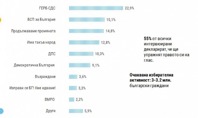 ГЕРБ задържа лидерската си позиция с 22.9% със сериозна дистанция от втория, която е близо 8% от заявилите, че ще гласуват.