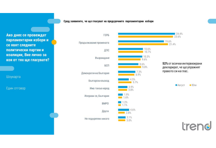 През август има лек спад на подкрепата за “Продължаваме промяната” (19,6% сред гласуващите), поради което и преднината на ГЕРБ (24,4% от гласуващите) вече е близо 5%. Силно оспорвана е третата позиция между ДПС (10,6%) и “Възраждане” (10,3%).