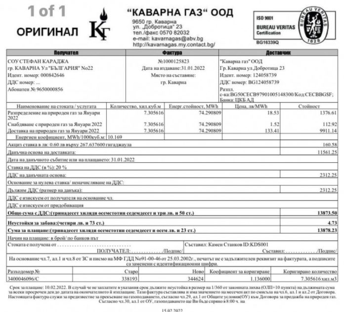 13 878 лв. е сметката за газ на Средно училище “Стефан Караджа” Каварна за месец януари 2022 г. Това става ясно от публикация в социалните мрежи.