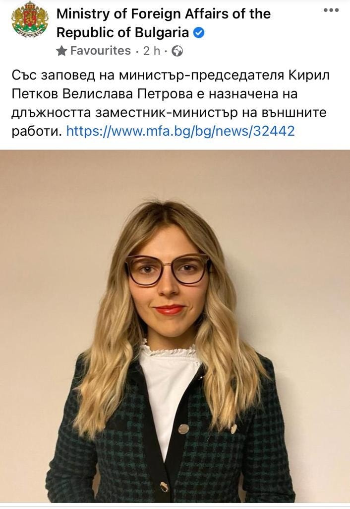 07.01.22 – Велислава Петрова е назначена за зам.министър на външните работи.