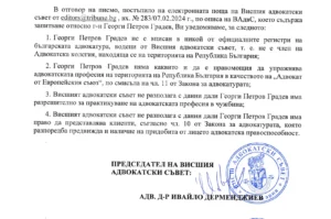 Георги Петров Градев няма каквито и да е правомощия да упражнява адвокатската професия на територията на Република България в качеството на „Адвокат от Европейския съюз“, по смисъла на чл. 11 от Закона за адвокатурата, се казва още в отговора на запитването.