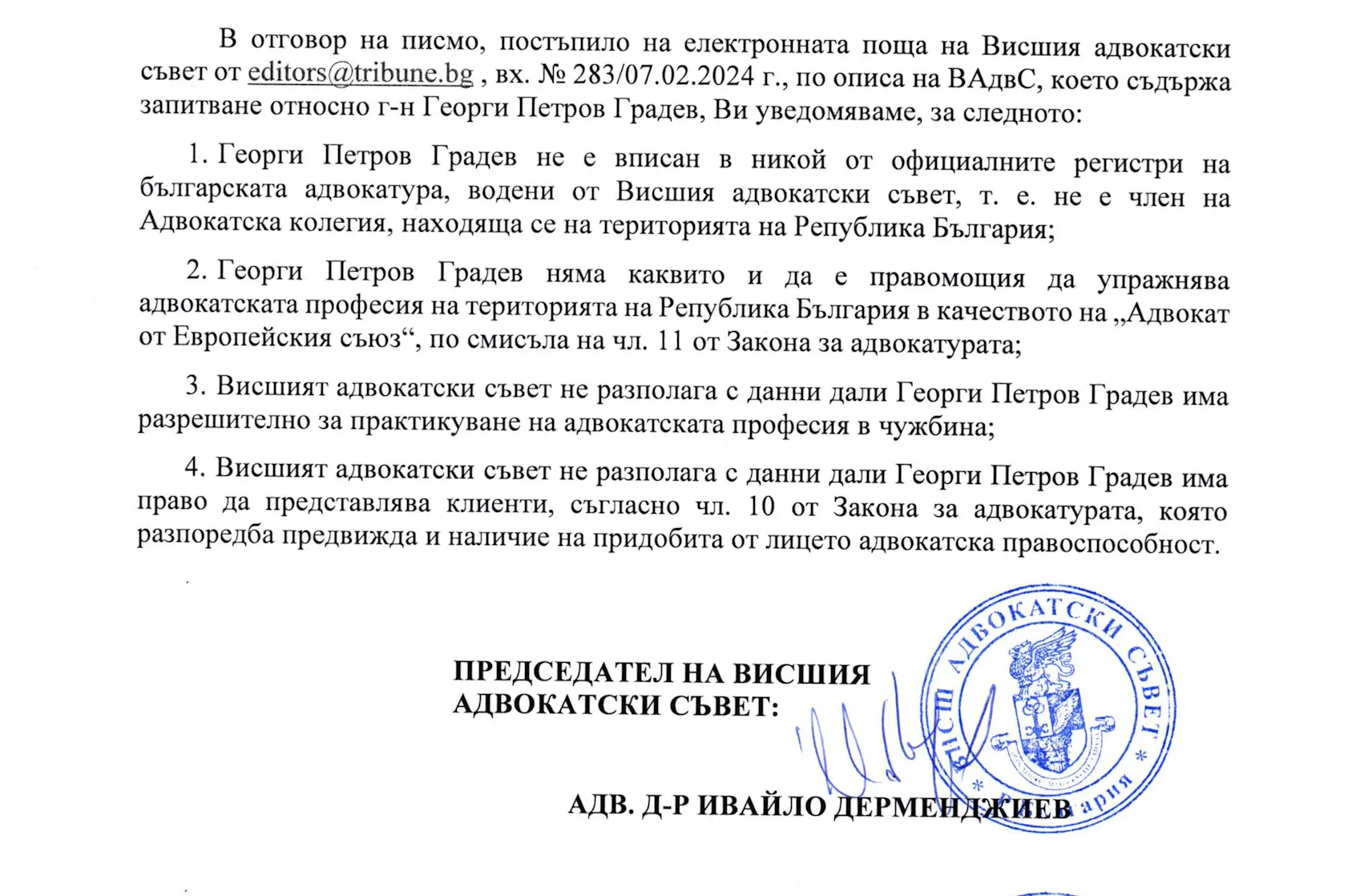 Висшият адвокатски съвет: Георги Петров Градев няма каквито и да е правомощия да упражнява адвокатската професия, не е вписан в никой от официалните регистри на българската адвокатура