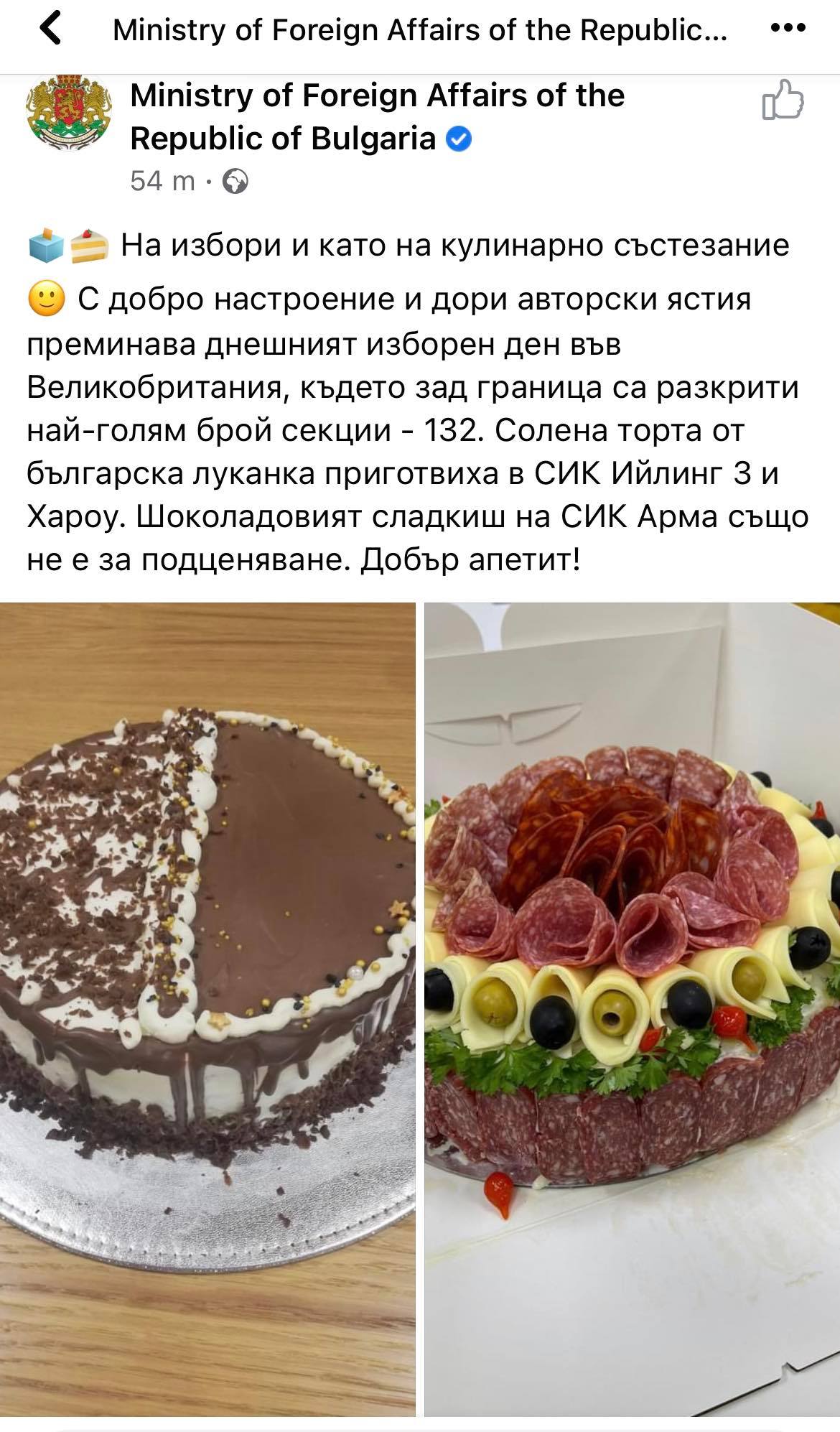 Простотиите на временното правителство на Румен Радев по организацията на изборите достигат невиждани висоти. Вместо да научим как вървят изборите зад граница официалната страница на Министерство на външните работи във фейсбук ни информира с текст и снимки….за кулинарно състезание. Ето текста: На избори и като на кулинарно състезание. С добро настроение и дори авторски ястия преминава днешният изборен ден във Великобритания, където зад граница са разкрити най-голям брой секции – 132. Солена торта от българска луканка приготвиха в СИК Ийлинг 3 и Хароу. Шоколадовият сладкиш на СИК Арма също не е за подценяване. Добър апетит!