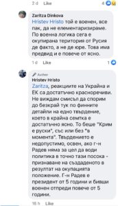 Същевременно заместник-министъра на външните работи Зарица Динкова, назначена с протекциите на Демократична България като част от Зелено движение, громи опонентите на Радев във фейсбук по скандала с Украйна, в който президента обяви за руски.
