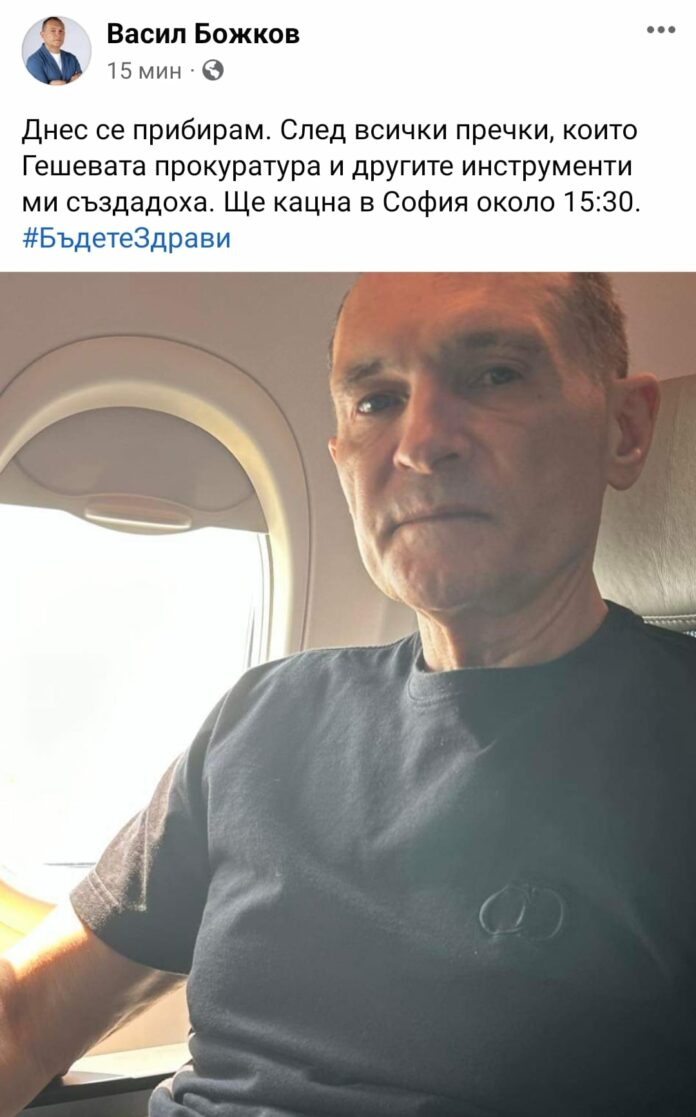 „Днес се прибирам. След всички пречки, които Гешевата прокуратура и другите инструменти ми създадоха. Ще кацна в София около 15:30.“ написа във фейсбук Васил Божков.