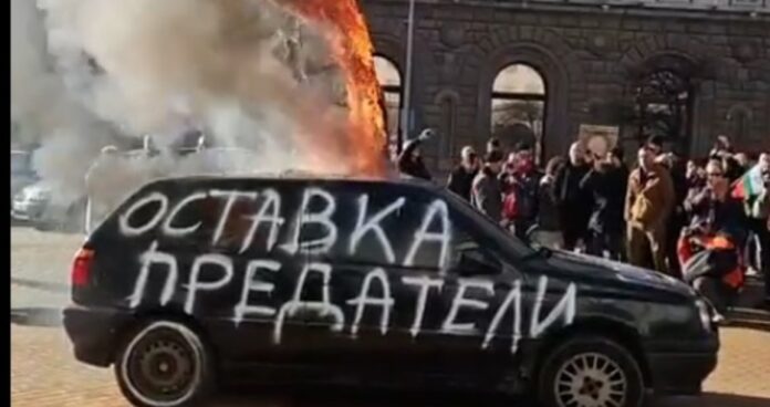 „Възраждане“ запалиха чучело върху кола на Ларгото между сградите на Министерския съвет, Народното събрание и президентството.