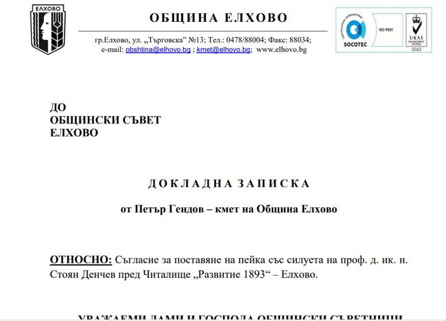 Това стана ясно от внесена в Общинския съвет на гр. Елхово докладна записка от кмета на града Петър Гендов за даване на съгласие за поставяне на пейка със силуета на Денчев на площада пред местното читалище „Развитие 1893“ (Елхово е родното място на Стоян Денчев, б.а.).