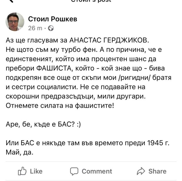 Водещият в телевизията на БСП-БСТВ Стоил Рошкев излезе с емоционален пост в социалните мрежи. В него той пише, че ще гласува за проф. Анастас Герджиков, защото той е единственият, който има реален шанс да победи фашиста Румен Радев. Ето целият му пост: