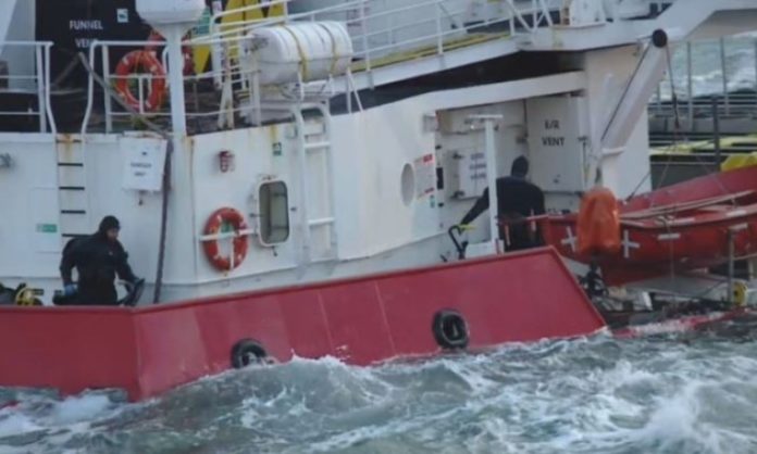 Двама водолази успяха да се качат на затъналия край Камен бряг кораб „Вера Су“. Операцията по огледа на плавателния съд се провежда при лошо време.