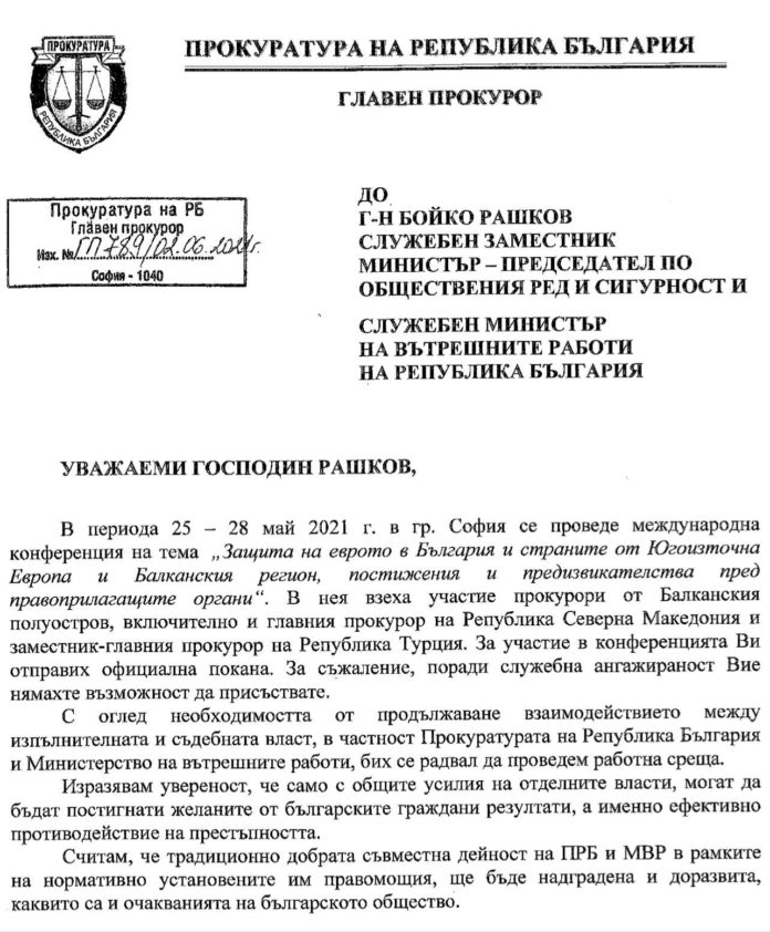 В писмото на Иван Гешев се отбелязва, че в периода 25-28 май 2021 г. в гр. София е проведена международна конференция „Защита на еврото в България и страните от Югоизточна Европа и Балканския регион. Постижения и предизвикателства пред правоприлагащите органи“, за участие в която е отправена покана и до служебния министър на вътрешните работи. Същата е била отклонена поради служебен ангажимент на министър Рашков.