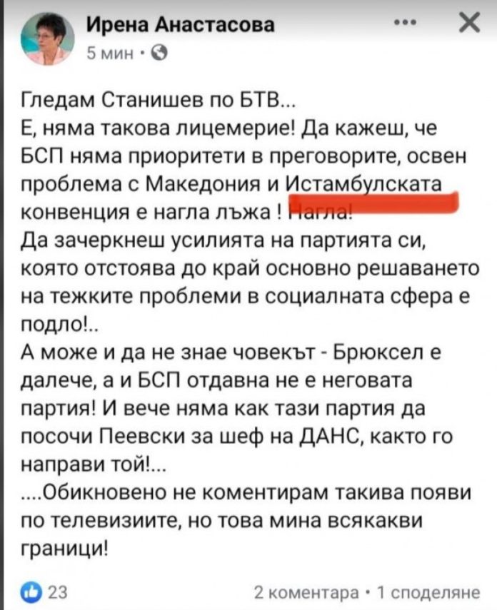 Ирена Анастасова от БСП нарече Сергей Станишев „лицемер“. Повод за думите ѝ стана изказване на лидера на ПЕС по бТВ, че БСП няма приоритети в преговорите освен проблема с Македония и Истанбулската конвенция, което според социалистката е нагла лъжа.
